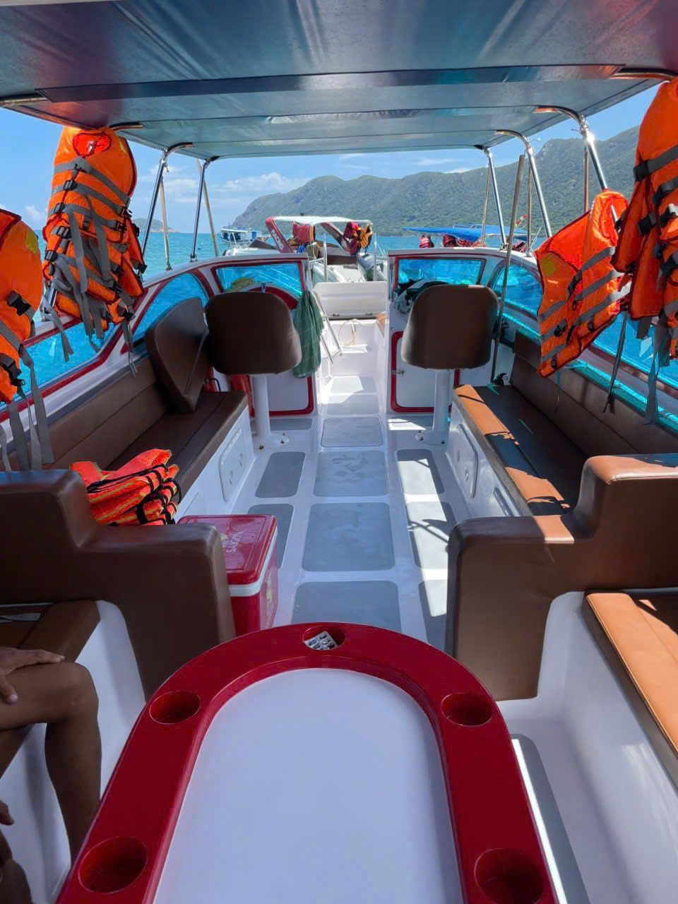 Trên cano (Speedboat): Phục vụ nước suối & trái cây tươi.